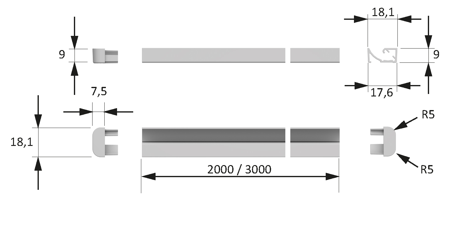 Einseitig gerichteter Abstrahlwinkel von ca. 90° Filigranes Einlassprofil in Aluminium eloxiert